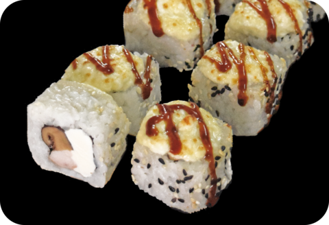 рис, сыр, нори, курица копченая, грибы шиитаке, кунжут (чб), соус на выбор