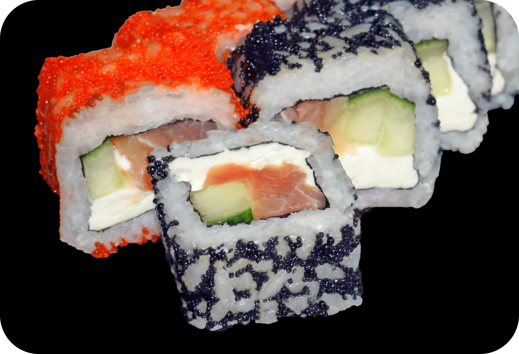 рис, нори, сыр, краб, авокадо, лосось (шапка), тунец (шапка), икра масаго