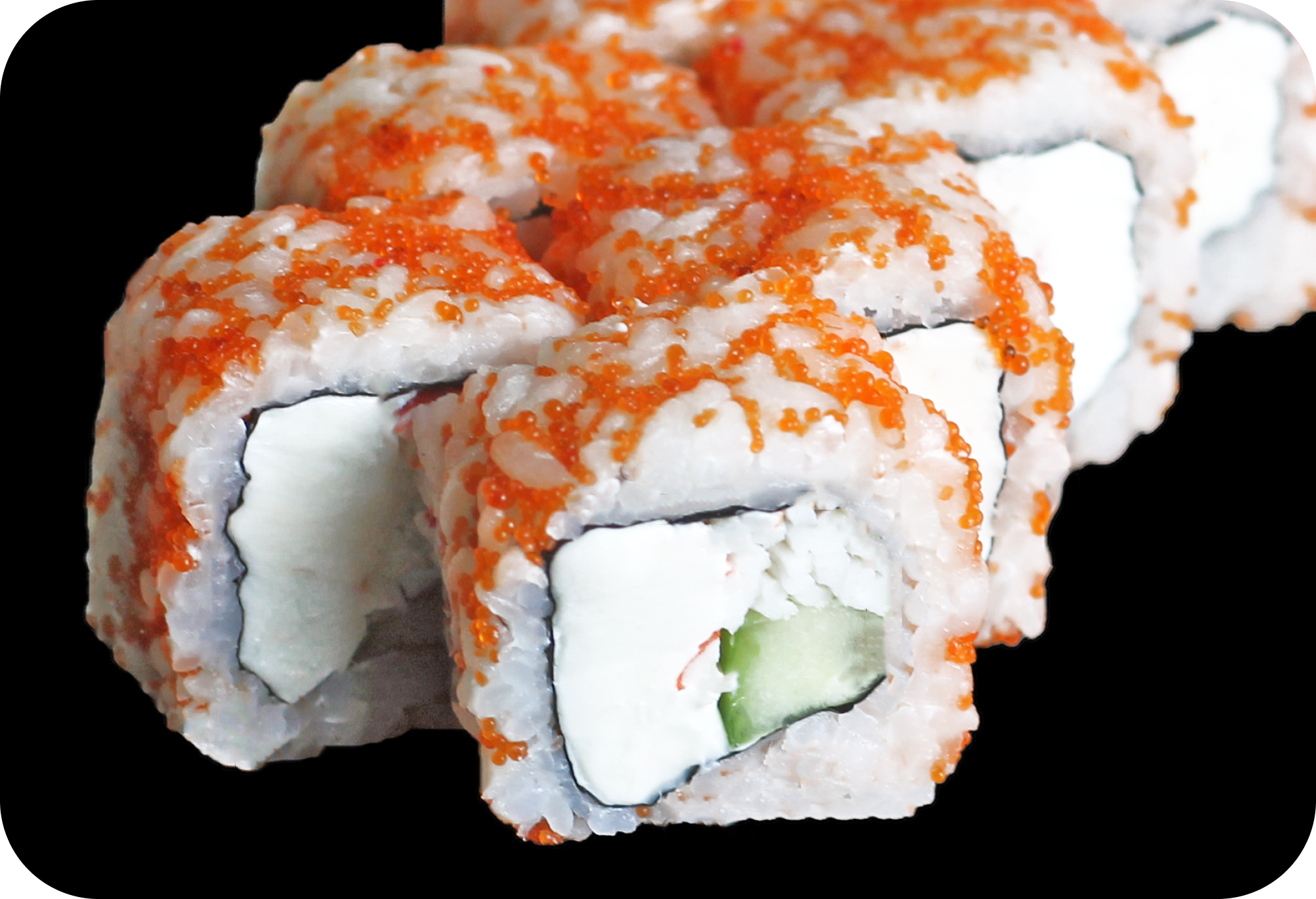 рис, нори, сыр, краб, авокадо,  лосось (шапка), тунец (шапка), икра масаго
