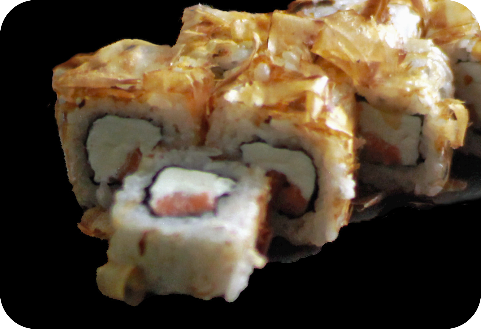 Классическое сочетание нежного лосося и сливочного сыра. Сверху они щедро посыпаны воздушной стружкой тунца, которая добавляет блюду яркий вкус и оригинальную текстуру. Простота и изысканность в каждом кусочке.