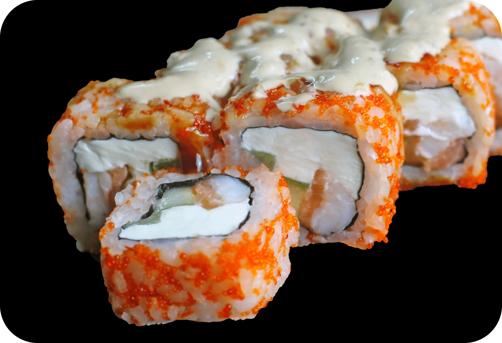 рис, нори, сыр, краб, авокадо, лосось (шапка), тунец (шапка), икра масаго