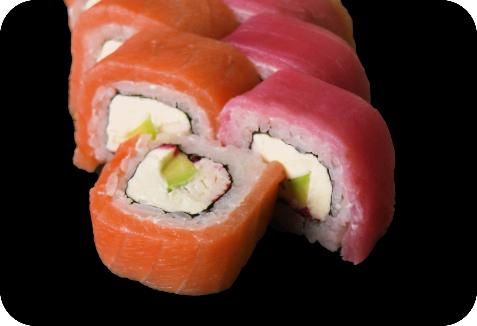 Эти роллы сочетают в себе нежную начинку из краба и авокадо с роскошной двойной шапкой из лосося и тунца. Украшенные хрустящей икрой масаго, они предлагают насыщенный вкус и элегантный вид. Наслаждение в каждом кусочке.