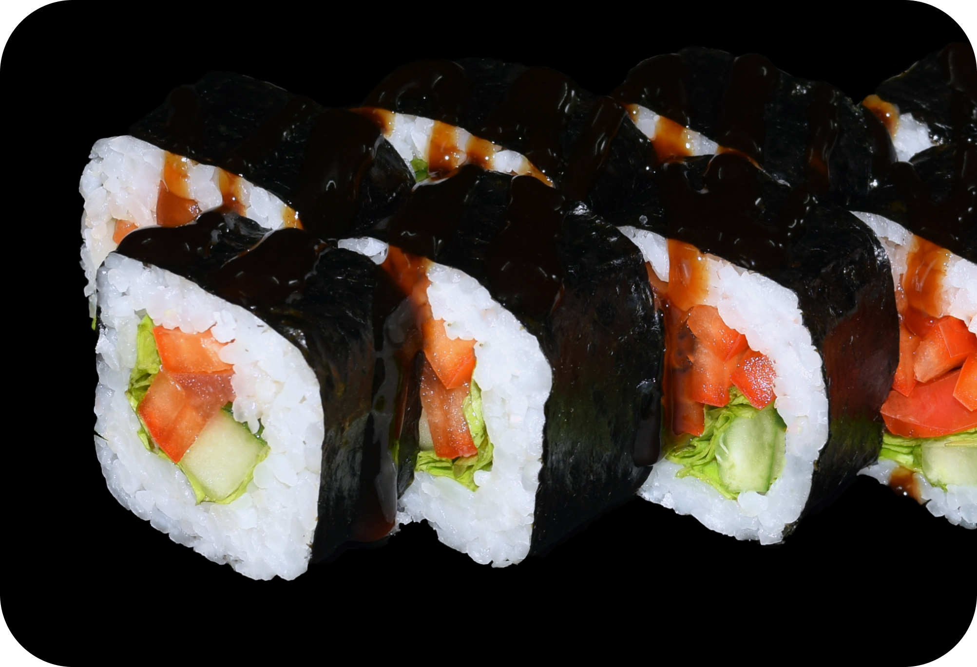 рис, нори, сыр, огурец, унаги соус, лосось-угорь (шапка)