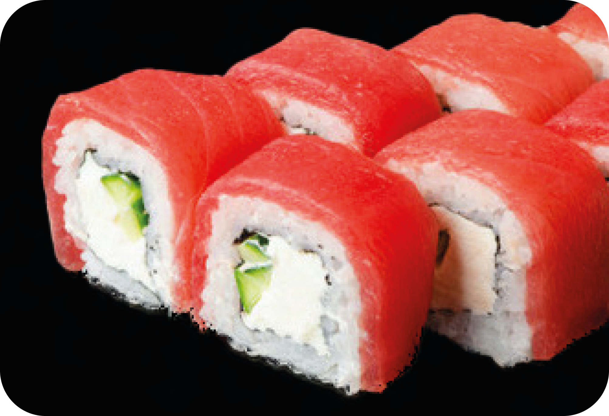 рис, нори, сыр, краб, авокадо,  лосось (шапка), тунец (шапка), икра масаго