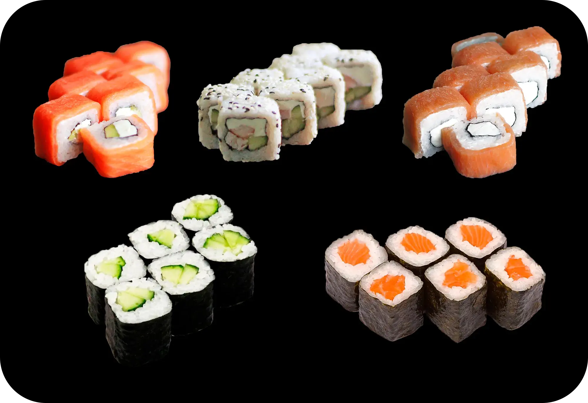 Аризона, Филадельфия, Нежный лосось, Ролл огурец, Ролл лосось