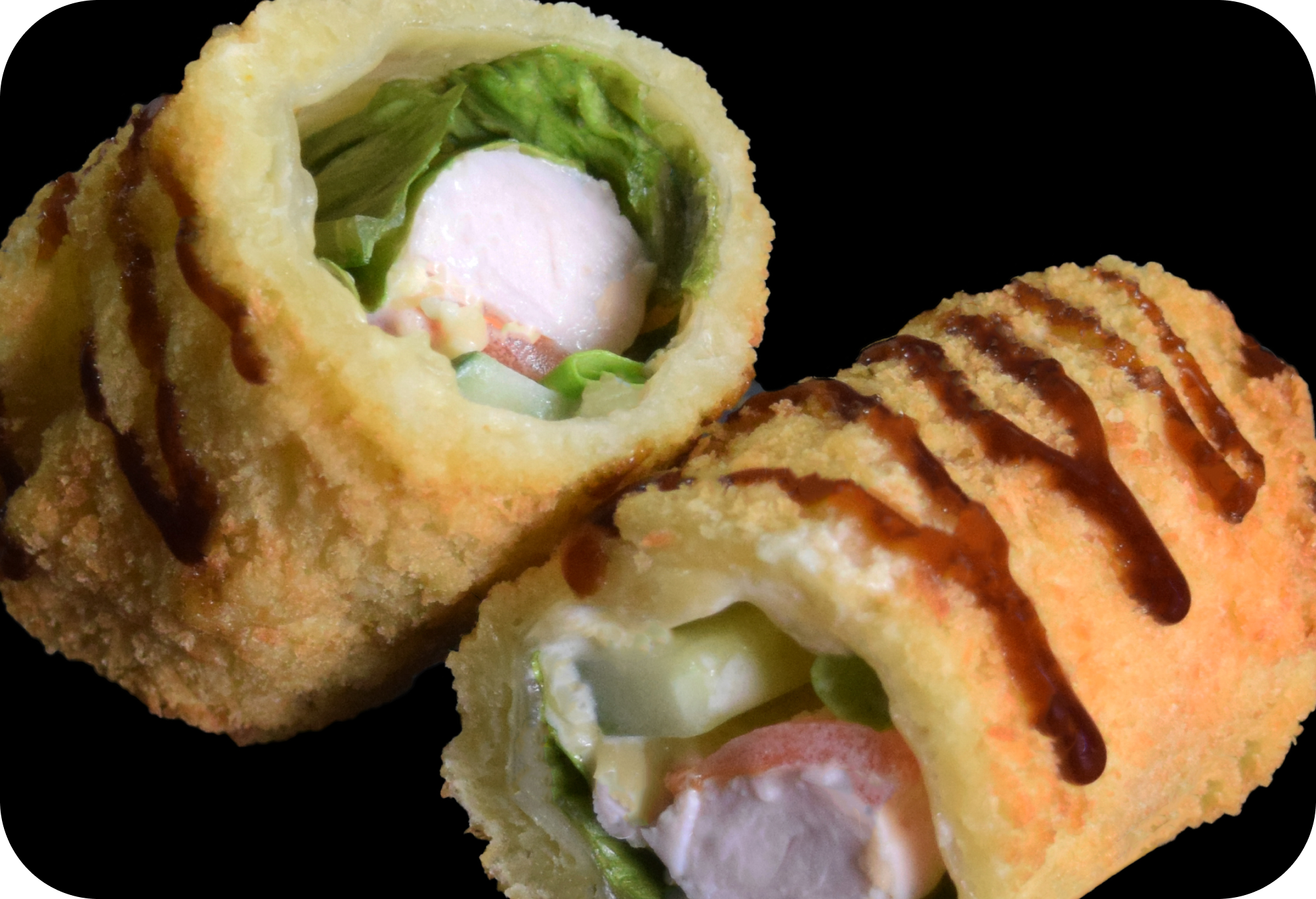 Унаги соус, Лосось, Огурец, Салат, Креветка, Рисовая бумага, Темпура, Сыр творожный, Икра массаго